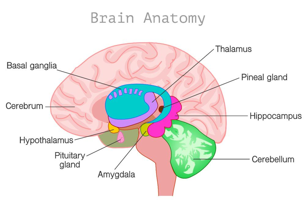 [It] lies within the roof of the third ventricle, deep within the brain… The ventricles are fluid-filled spaces, and the third ventricle extends from the large lateral ventricles to the narrow cerebral aqueduct, passing between the two halves of the part of the brain called the diencephalon. It is located within an area called the epithalamus, just behind the thalamus and above the cerebellum, resting at the back of the brain, near the brain stem. There is a small fluid-filled pineal recess that projects into the stalk of the pineal body, allowing for the hormones it produces to more easily be diffused throughout the brain. – Brandon Peters MD
